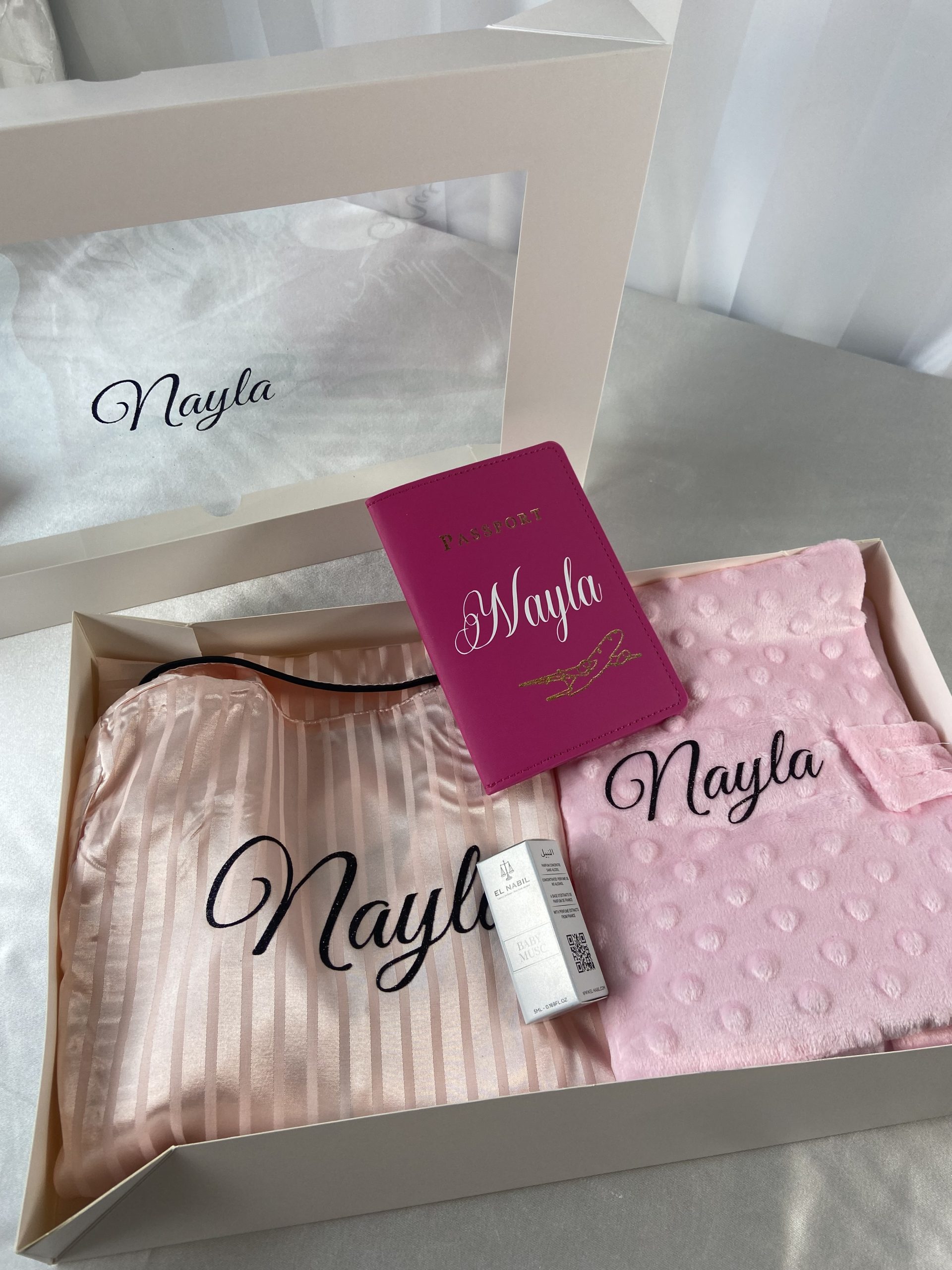 • pyjama , body , bavoir , moufle , bonnet, chaussette , chausson , baby musc , couverture , cape de bain , protège carnet de santé , lange le tout dans une box premium